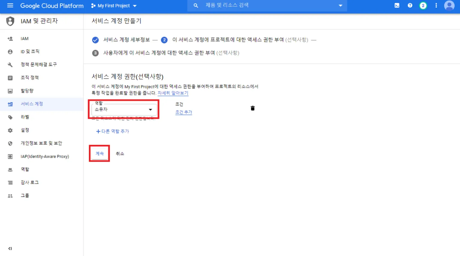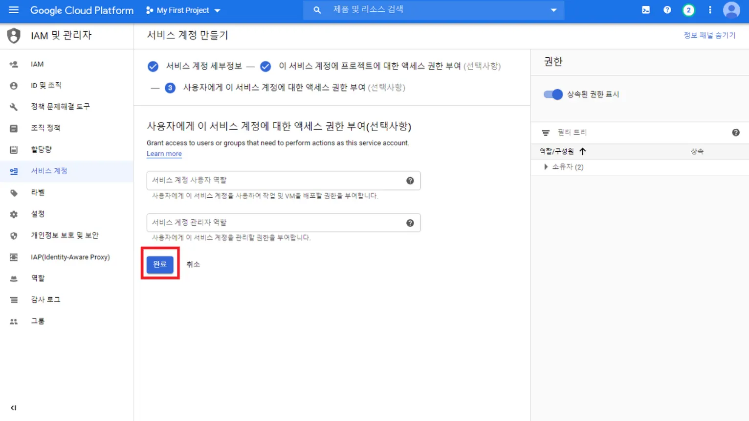 역할은 모든 접근 권한을 갖는 소유자를 선택하고 진행