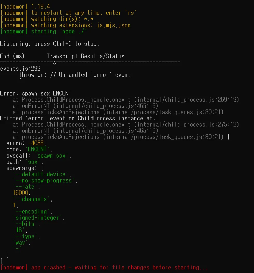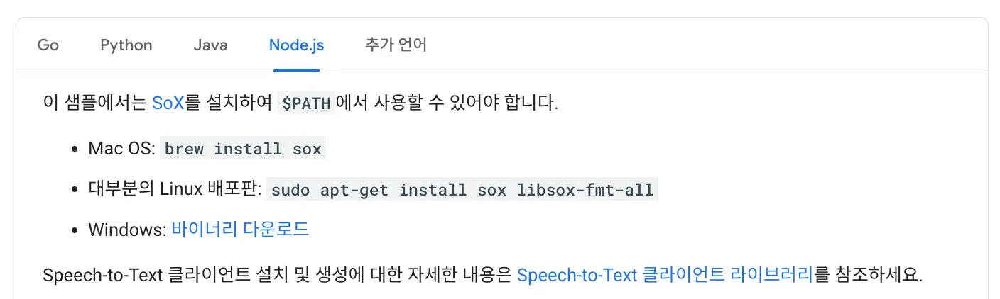 다음의 사이트 중 node.js sox 설치 참조