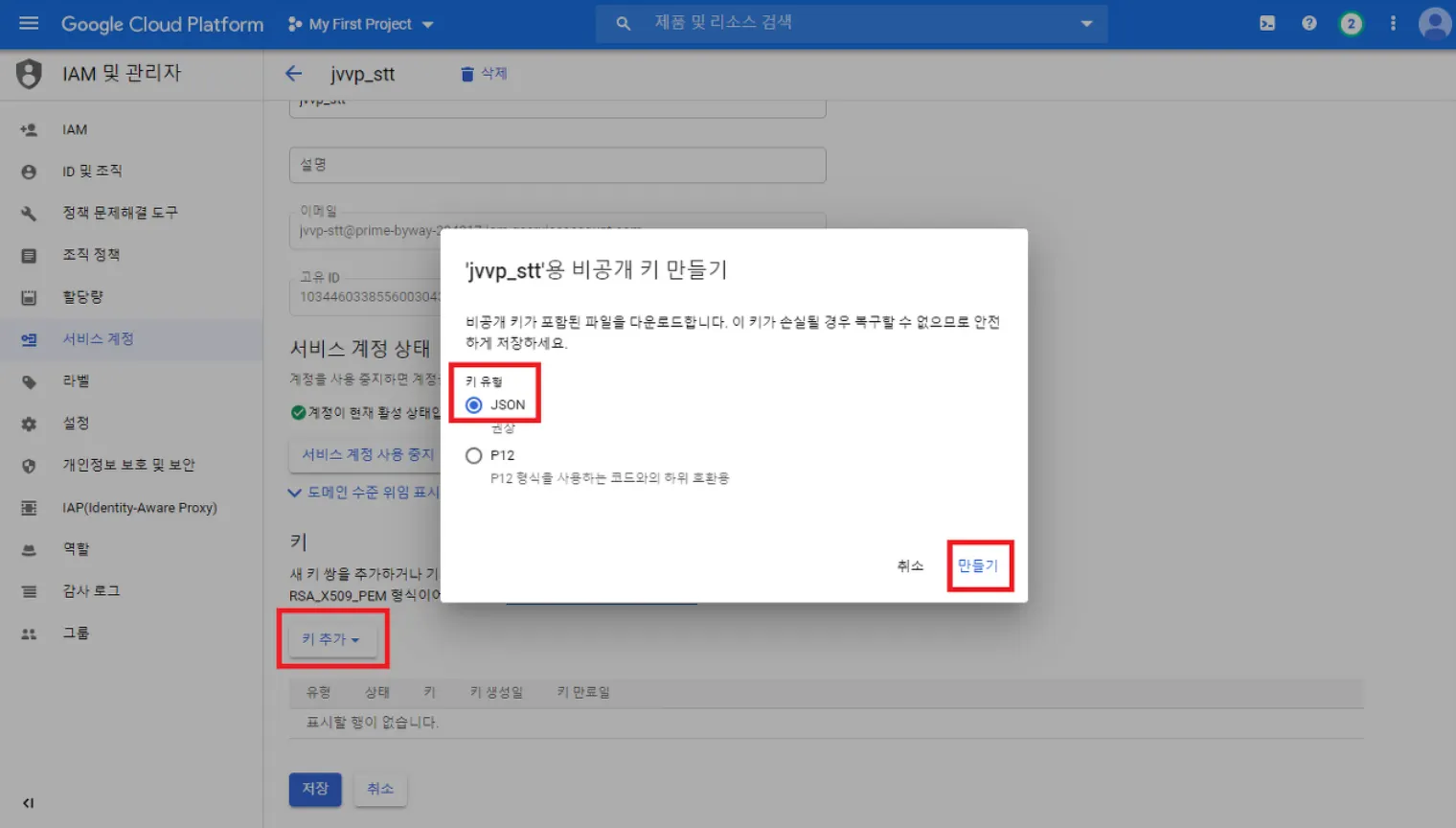 하단의 키 추가 → JSON 파일 형식으로 생성