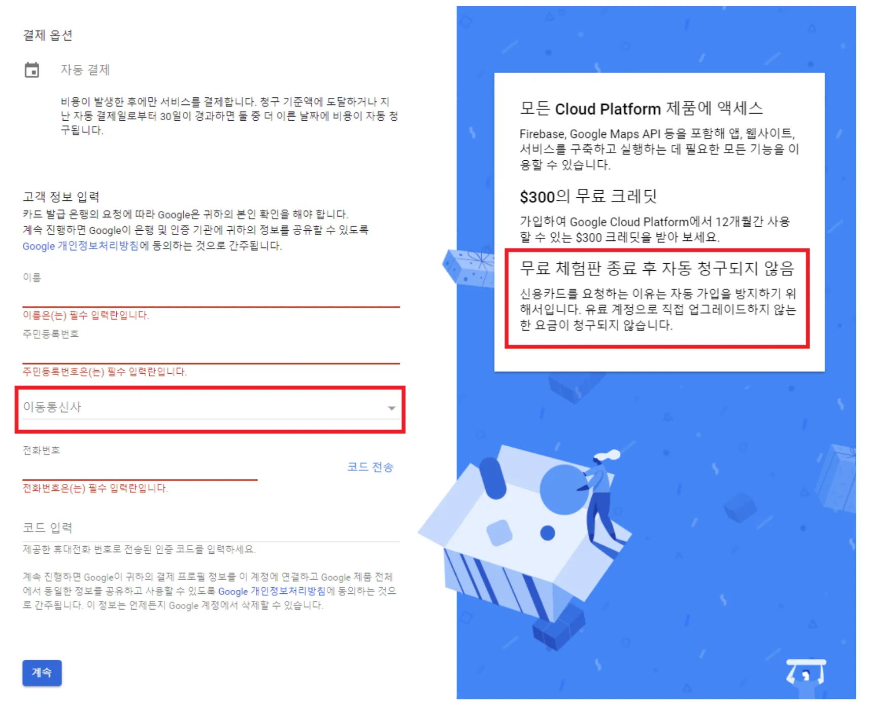 핸드폰 인증 후 신용카드 정보 요구 (무료 체험판 종료 후 자동으로 청구되지 않음)
