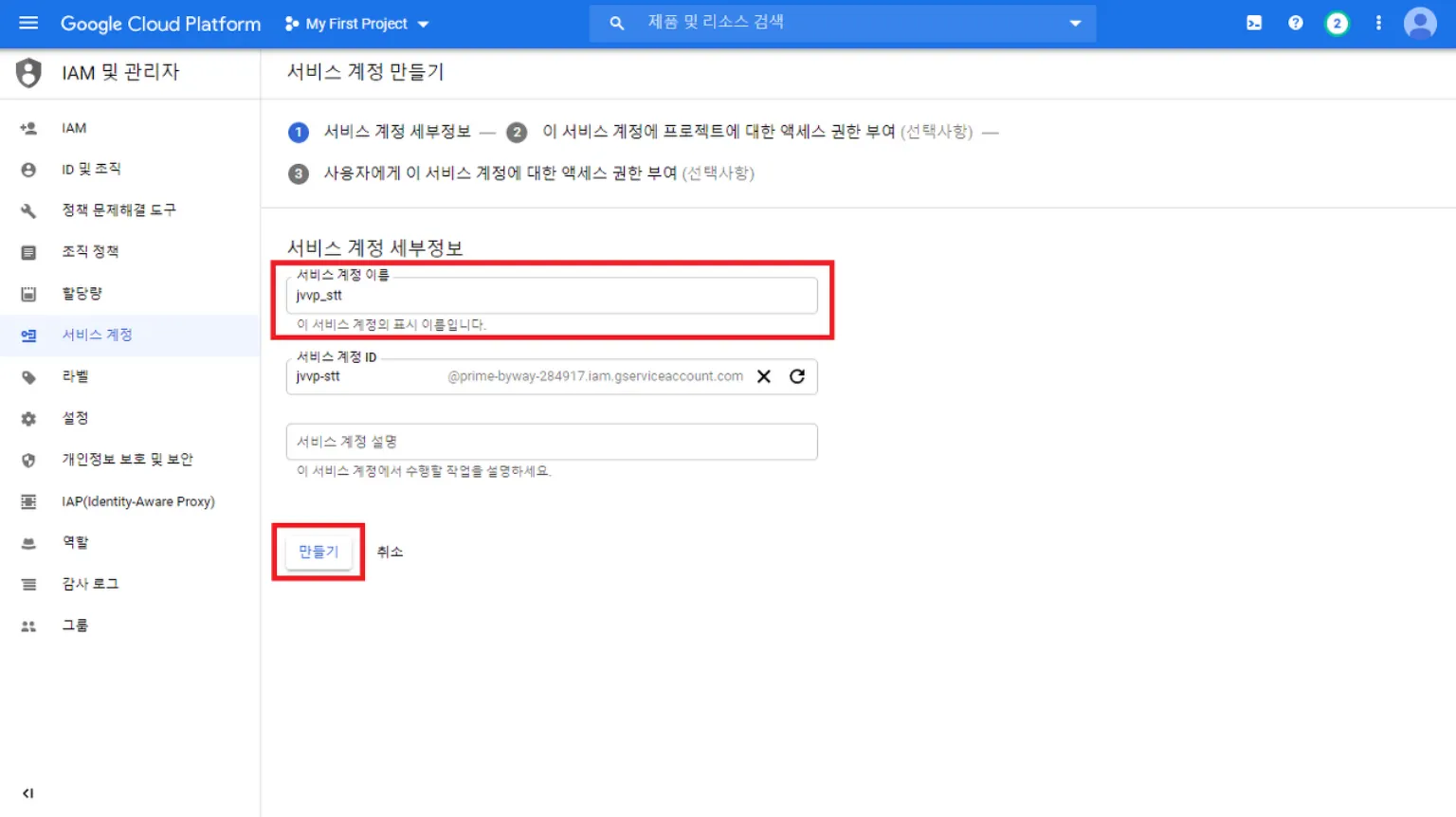 서비스 계정 입력 후 생성
