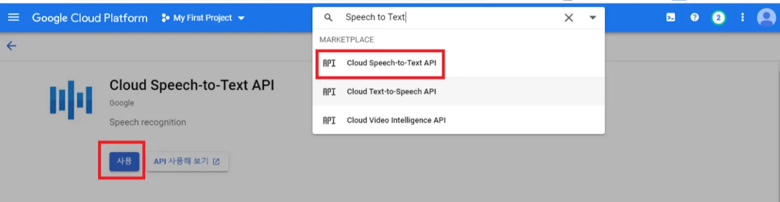 상단 검색바에 speech to text 검색 후 → “사용” 클릭