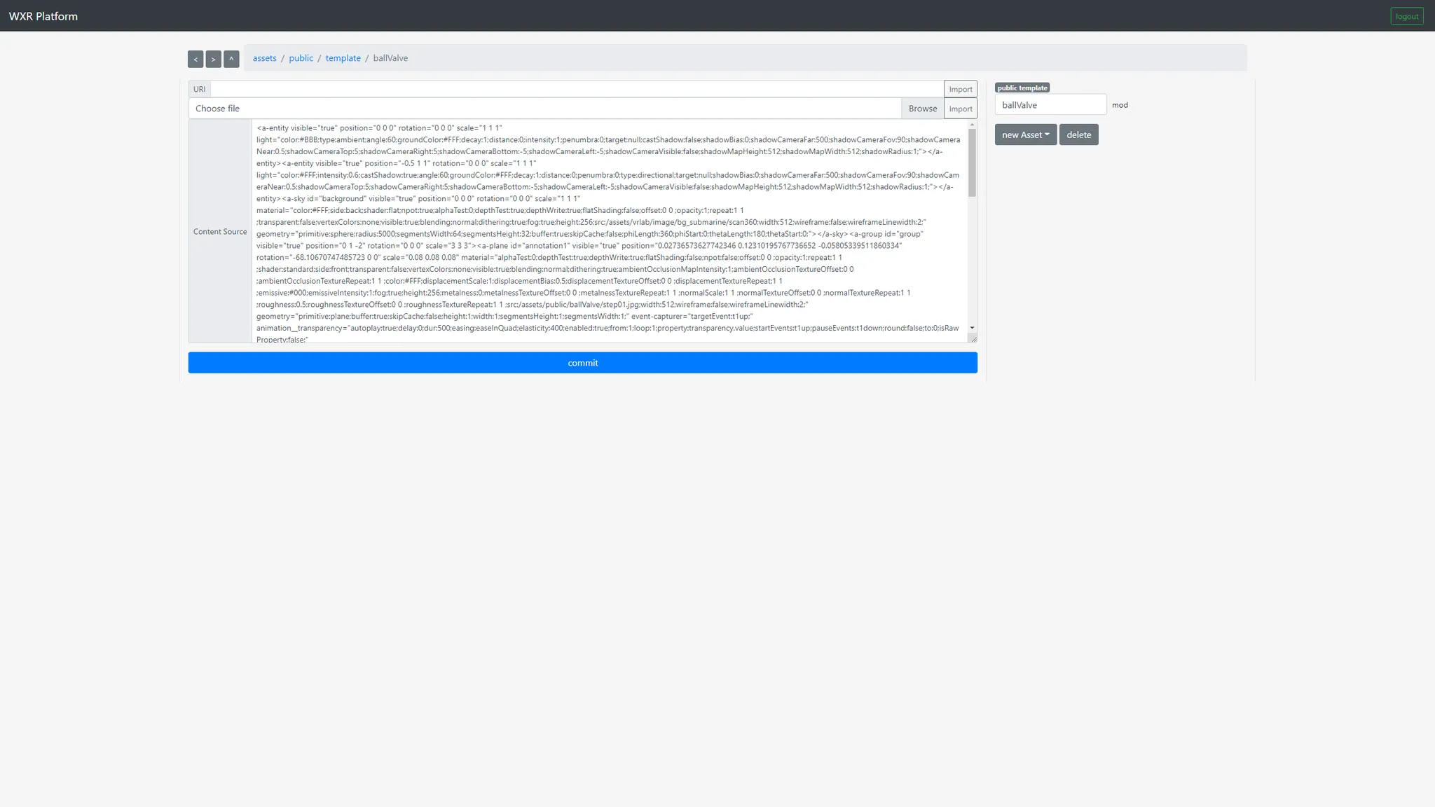템플릿 타입의 애셋 뷰는 다음과 같이 에딧박스로 편집할 수 있는 UI가 주어지고, 외부 사이트에서 URI를 통해 import하거나 로컬 파일 시스템에서 브라우징하여 import할 수 있게 되어있다.