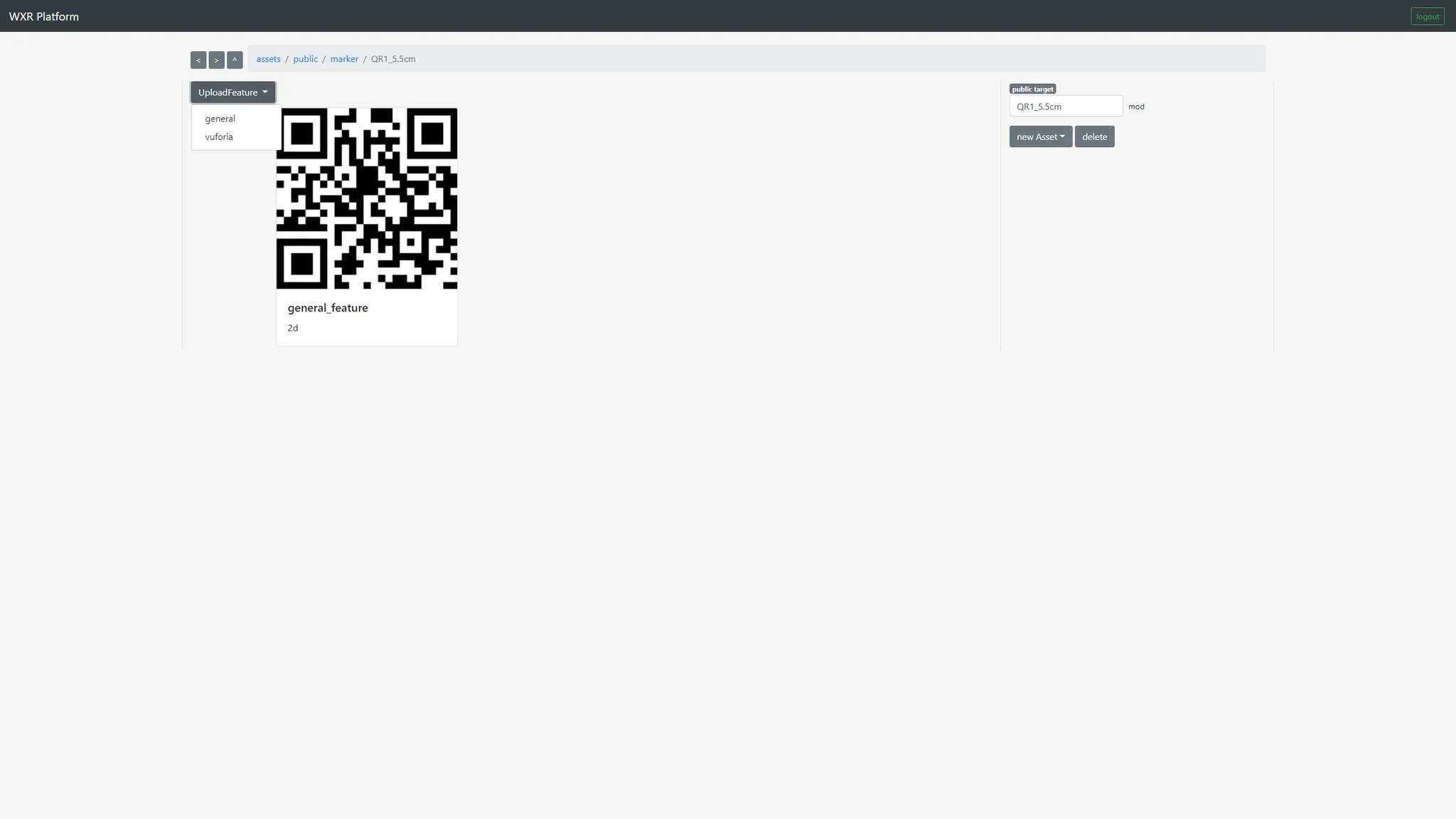 타겟 타입의 애셋은 워크스페이스 세션에서 AR 인터랙션을 하기 위해 트래킹하는 특징 형질이다. 하나의 타겟은 여러 AR 엔진의 feature를 업로드하여 다형성을 갖도록 구성할 수 있다. general feature는 raw 이미지이며 대부분의 AR 엔진에서 사용 가능하다. vuforia feature는 vuforia의 특징 추출 알고리즘을 통해 추출된 특징 형질이며 vuforia 엔진에서만 사용 가능하다.