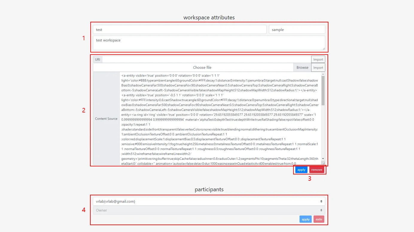 1번 가이드 박스 안에는 워크스페이스의 이름, 태그, 설명을 작성할 수 있는 입력란이 있다. 태그는 ,를 구분자로 하여 여러 개의 태그를 등록할 수 있으며 태그는 검색에 사용될 수 있다. 편집한 내용은 3번 가이드 박스의 apply 버튼을 눌러야 적용되며 적절한 권한이 있는 경우에만 수행되고 그렇지 않은 경우는 alert 창이 팝업되어 알려준다.